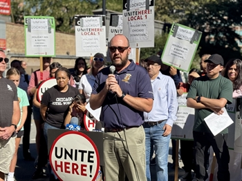 "Holiday Inn, you are in violation of our hospitality principles and we're here to call you out on it," said Father Clete Kiley, chaplain for the Chicago Federation of Labor.