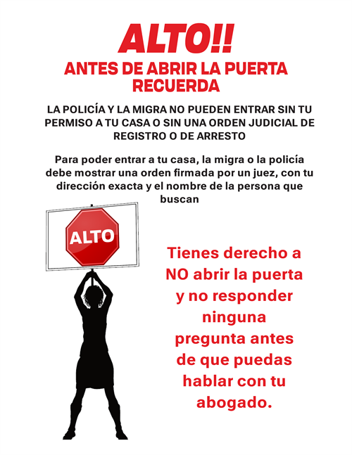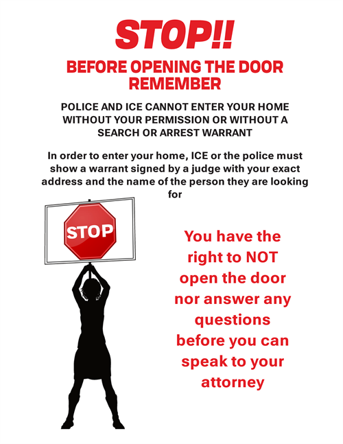 2) STOP! signs to post on the inside of your home doors to remind you police and ICE cannot enter your home without your permission or without a search or arrest warrant